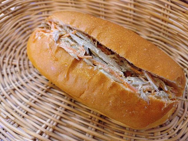 手作りのごぼうサラダは水っぽくなりがちだけど、そうならないように工夫して、ごぼうの香りと旨み、パリパリとした食感を楽しめるようなサンドになってます。